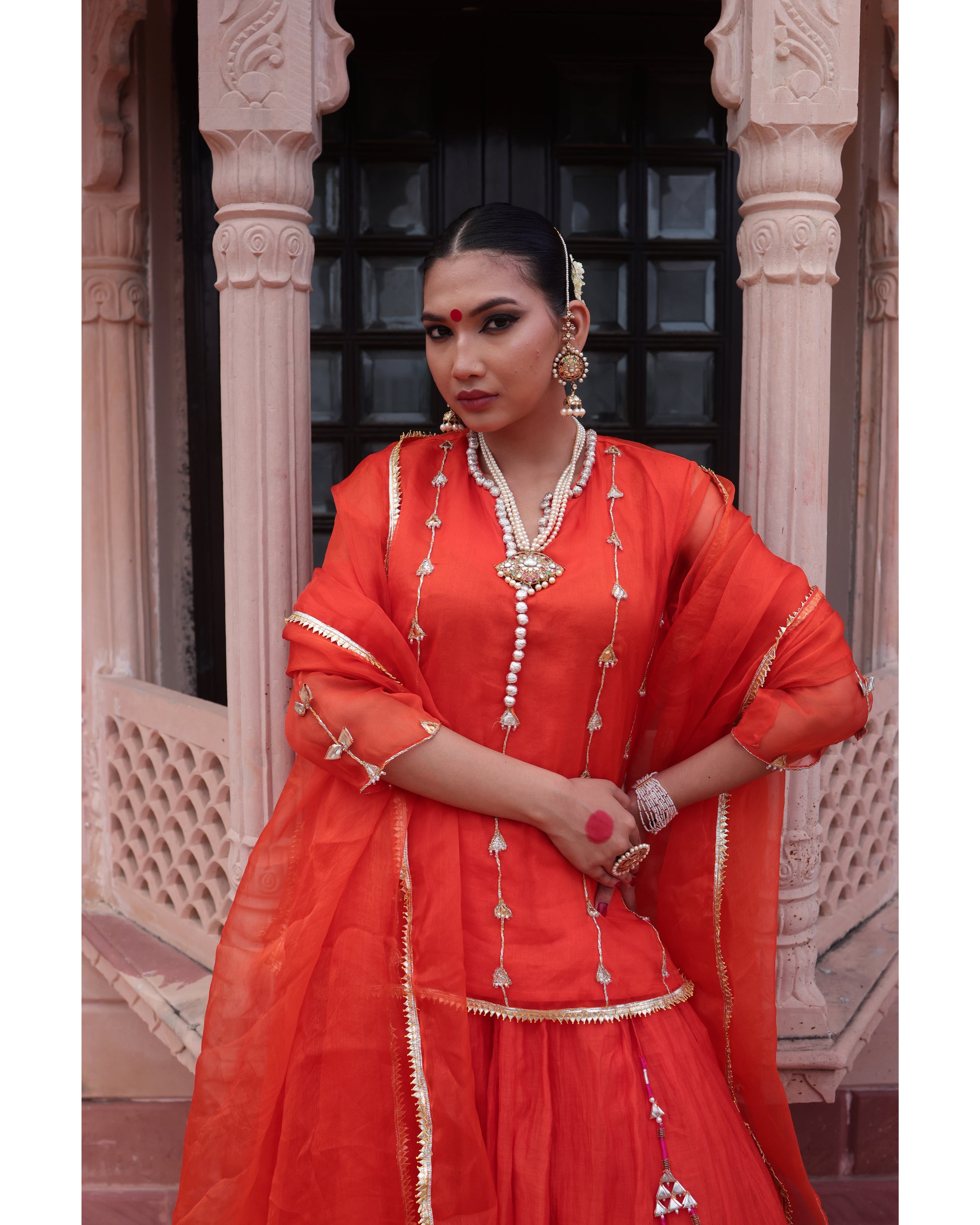 Orange Organza Kurti Paired with Chanderi Lehenga